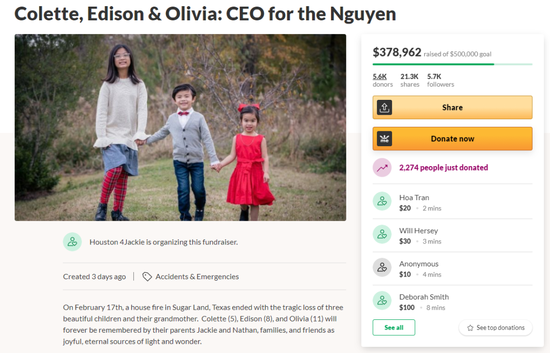 如今,家人为了纪念三个孩子,在GoFundMe建了一个捐款链接,目的是为Colette、Edison和Olivia建立一个持久的慈善基金会。基金会收到的捐款将会用于其他需要帮助的孩子,如自闭症患儿等。
