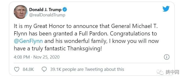 川普在一条推文中写道:“我很荣幸地宣布,迈克尔·T·弗林将军被完全赦免。祝贺@GenFlynn和他美好的家庭,我知道你们现在将有一个真正美妙的感恩节!”