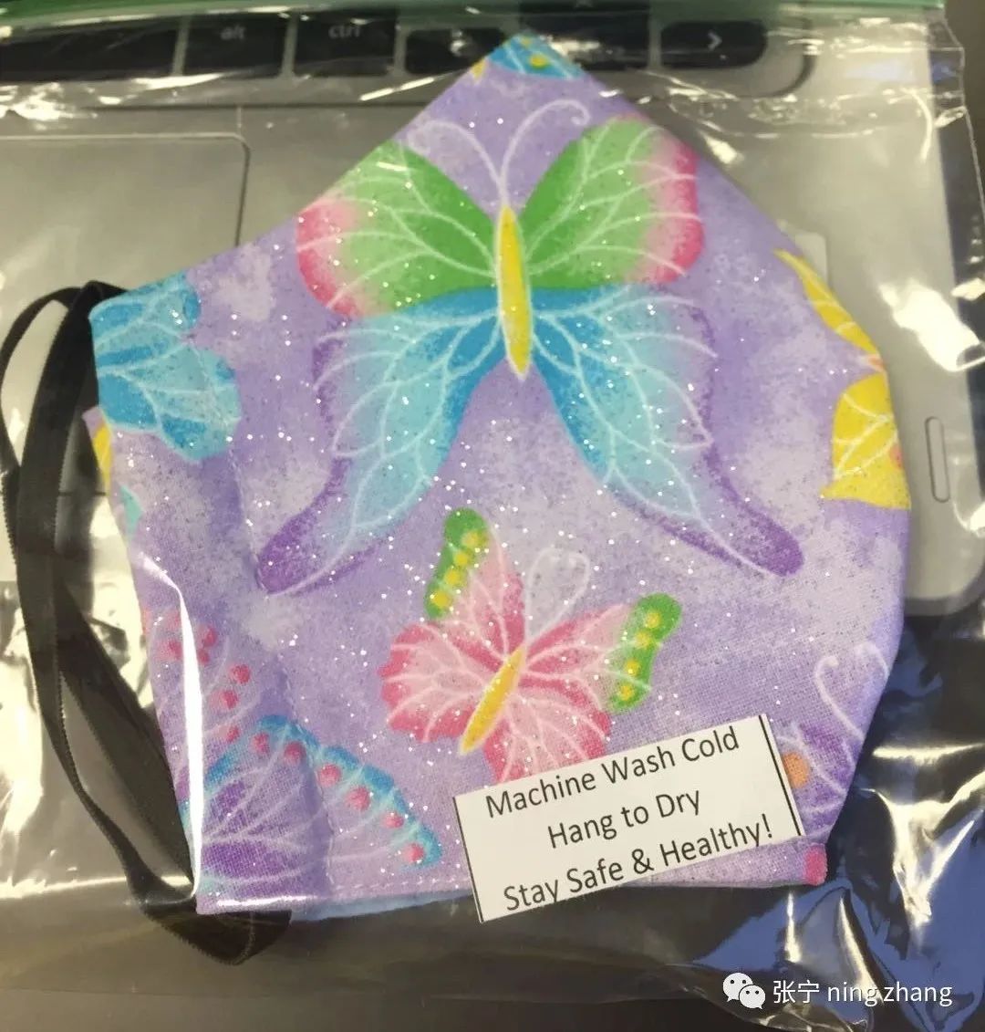 最令人感动的是一位八年级的女学生在暑假期间为全校的老师手工制作了口罩,男老师的口罩为素色,女老师的口罩则是花草蜂蝶的美丽图案,我选了一款蝴蝶,戴上正合适。此为第三惊喜。