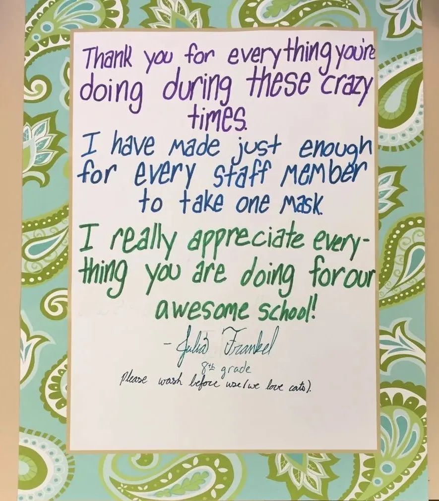 邻居奶奶步履蹒跚地走到我家门口,悄悄地留下一袋礼物:若干文具和清洁用品。年年开学,她都会以这种方式鼓励我,碰上今年的疫情,她在贺卡上写到:每天都会为你和其他老师学生祈祷。感恩~