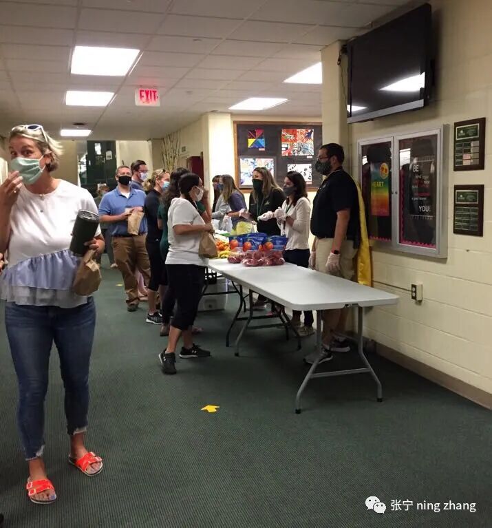 正在打开一封封邮件时,广播里突然传出愉快的音乐,然后,又听到热情而欢快的邀请:家委会为各位老师准备了早餐,请前往。来到图书馆前,同事们都戴着口罩正聚集聊天,大家见面都很亲切。家长们在一旁分发早餐,为老师们加油打气。