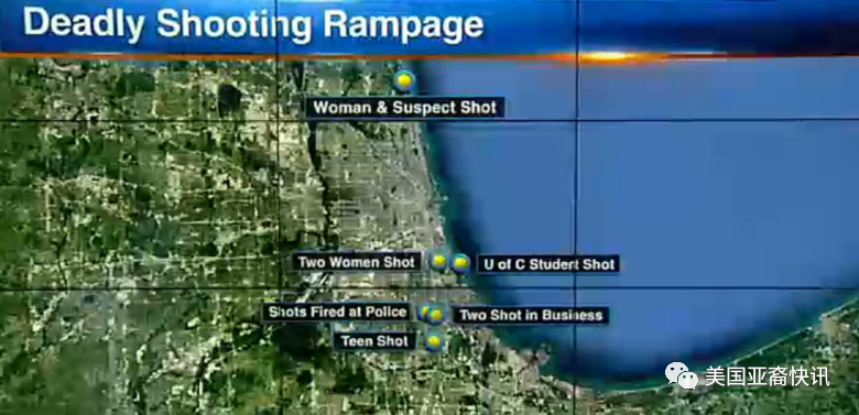 嫌犯持续一小时六个地点的滥杀,从距离芝加哥大学1.5英里的位于芝加哥南部的湖畔高层公寓到芝加哥北部距离西北大学2.5英里的IHOP餐厅