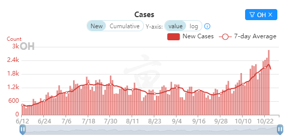 下面是俄亥俄和明尼苏达的新冠病例图,其中俄亥俄日增病例已逼近3000,明州也逼近2500: