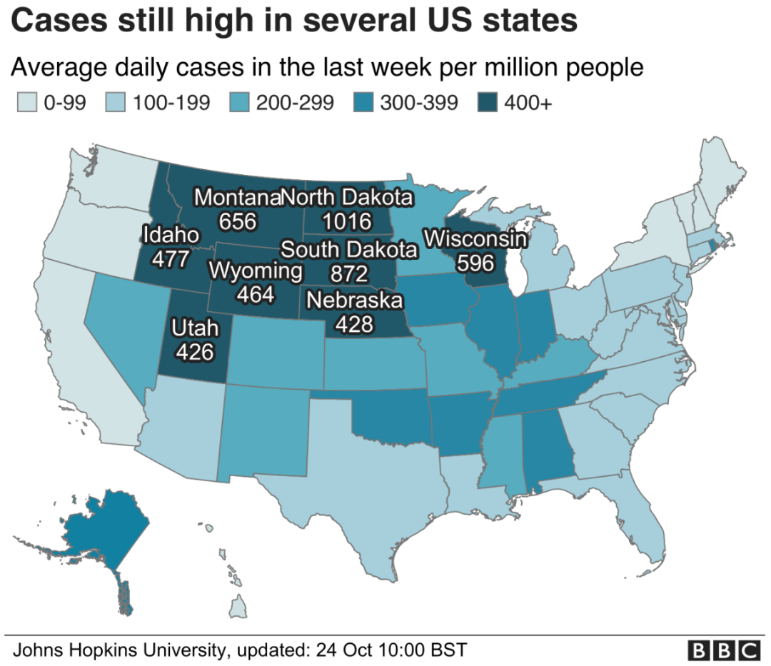 。根据约翰斯·霍普金斯大学的数据显示, 美国7天平均每日新增病例超过6.3万例,比9月中旬上涨了84% 。