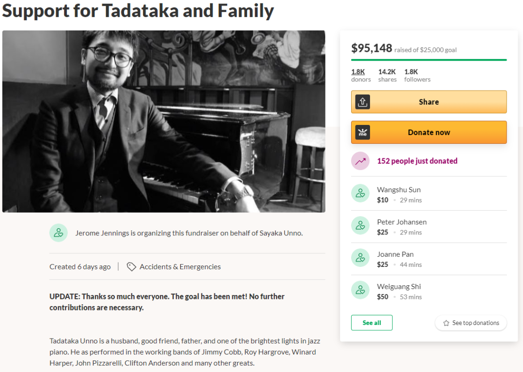 has now ended, raised $89,611 in funds to help pay for Unno’s emergency