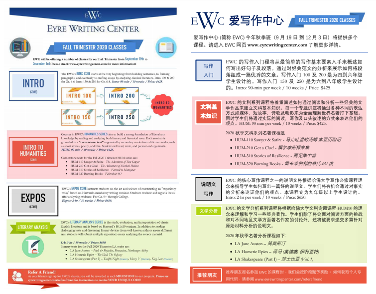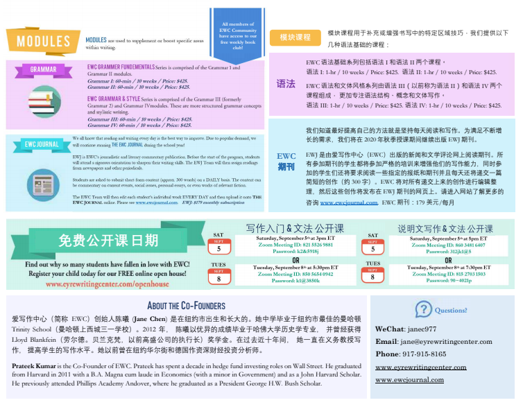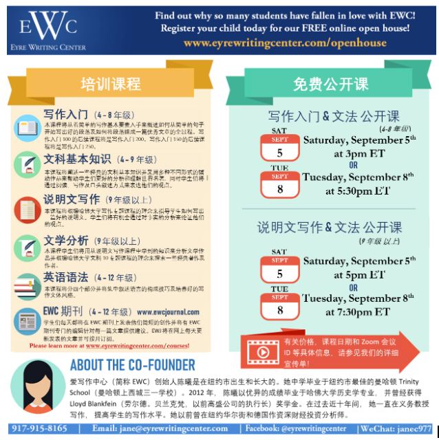 “爱写作中心”网站和已有的宣传材料都是英文的,为了帮助我们的读者了解她的中心,Jane特意为我们准备了中文版课程介绍如下。请根据孩子的年龄安排参加9月5日和8日的4节免费公开课,帮你和孩子进一步了解Eyre