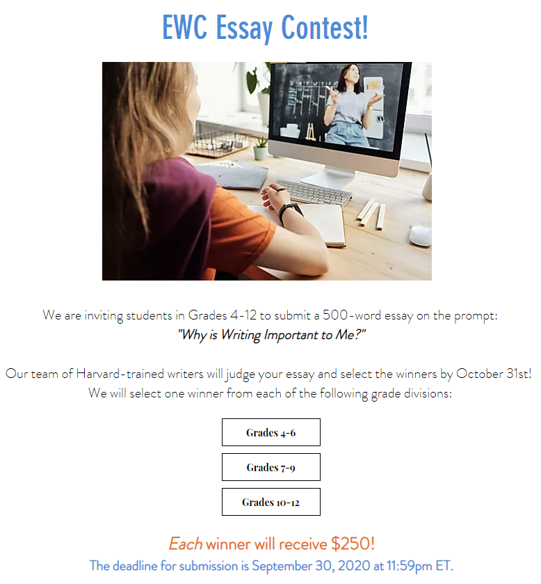 Center的网站上还看到中心正在组织作文比赛,9月底截稿,有三个$250大奖等你拿,相信很多家长会感兴趣让孩子参加。请赶快到下面的网站去报名(点击文末”阅读原文“链接直接进入)。