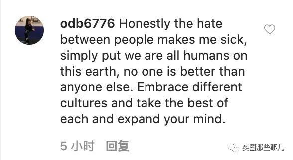 “老实说,人们之间的仇恨令我恶心。简单来说我们都是地球上的人类,没人比别人更优越。要拥抱不同的文化,取长补短,打开心扉。”